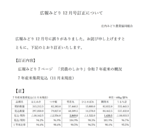 7 ページ 「営農のしおり」令和7 年産米の概況7年産米集荷見込(11 月末現在)に誤りがありましたので訂正いたします。