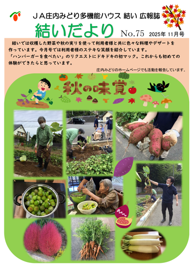多機能ハウス結い 広報誌 2025年 画像をクリックするとPDFファイルが開きます。 11月 10月 9月 8月 7月 6月 5月 4月 3月 2月 1月 2024年 画像をクリックするとPDFファイルが開きます。 12月 11月 10月 9月 8月 7月 6月 5月 2月 1月