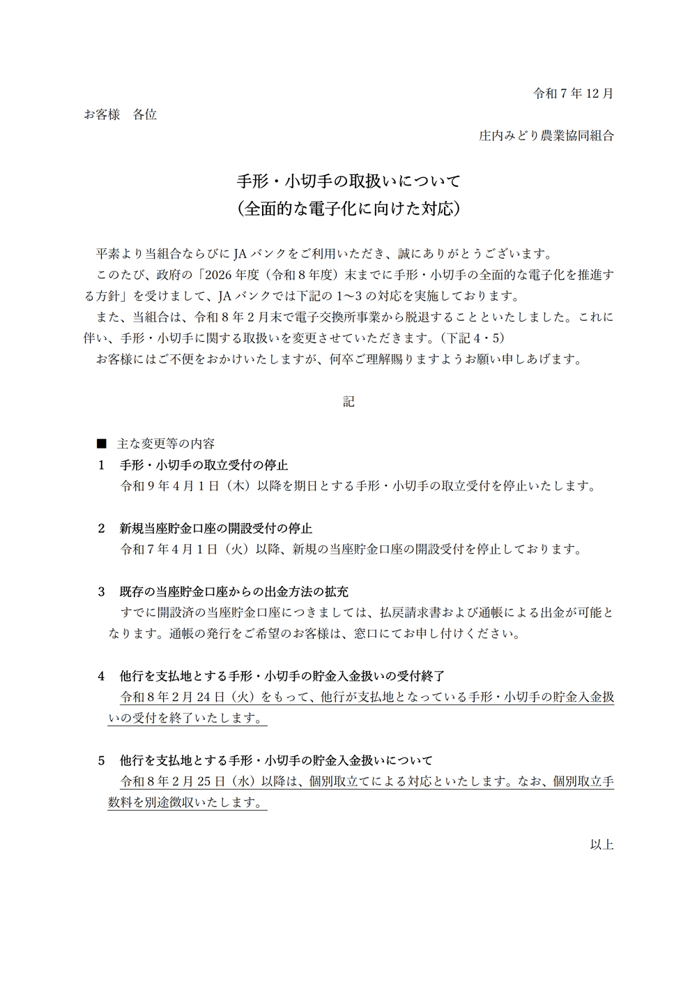 手形・小切手の取扱いについて(全面的な電子化に向けた対応)
